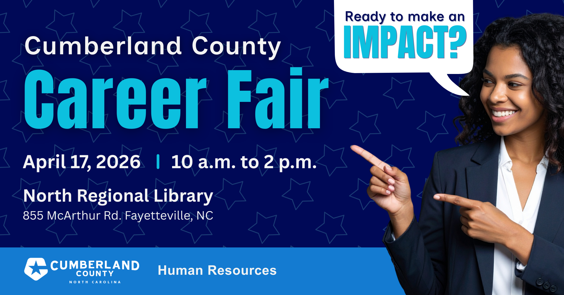 Graphic provided by Cumberland CountyCumberland County Government will host a career fair on Friday, April 17, from 10 a.m. to 2 p.m. at the Cumberland County North Regional Library, located at 855 McArthur Road in Fayetteville.The career fair is des ...