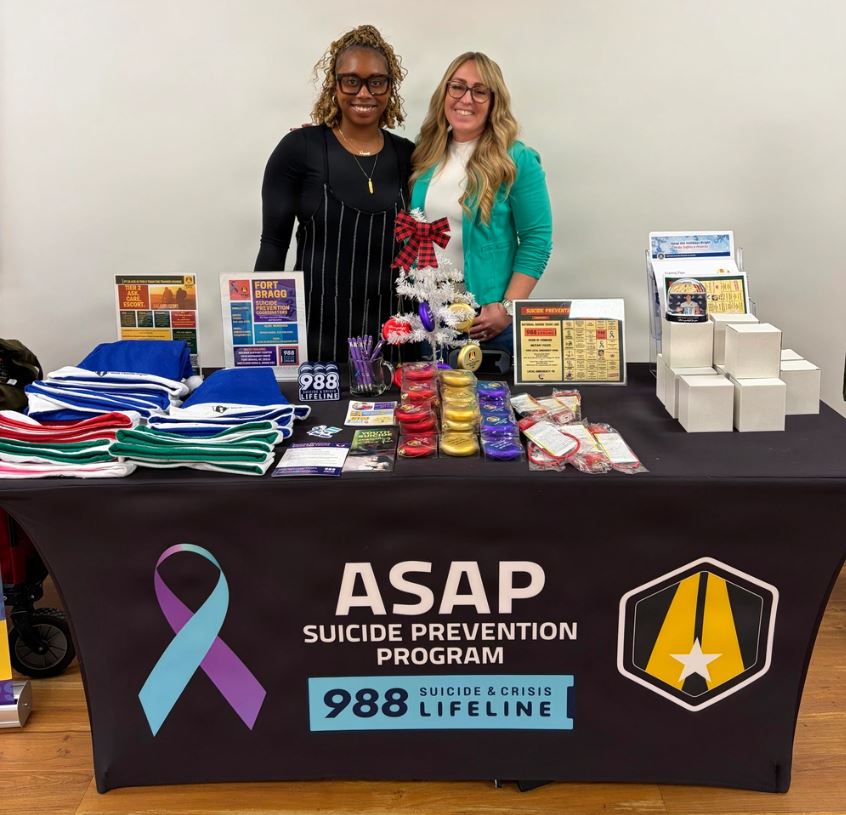 Jamila Ford (left) and Alise Menchaca (right), Fort Bragg Suicide Prevention Program Coordinators, at the Snow Globe of Hope tabling event Dec. 10.As the holiday season quickly approaches, the Army Substance Abuse Program’s Suicide Prevention team ho ...