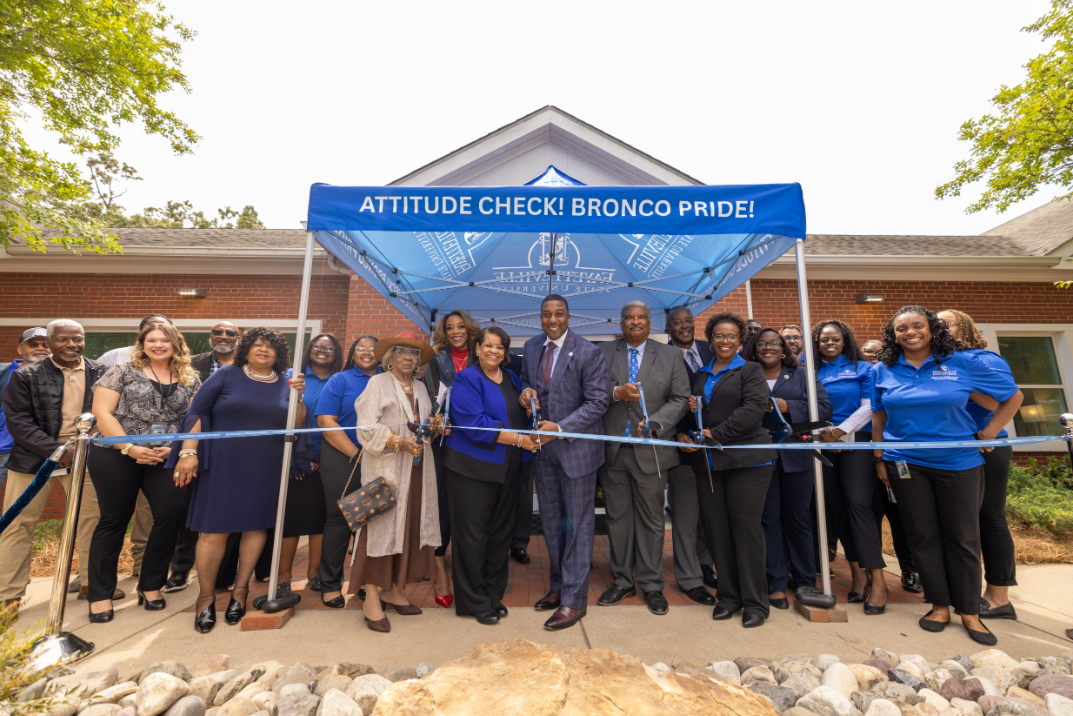 At center, Chancellor Darrell T. Allison and Juanette Council, Ed.D., vice chancellor for student affairs, cut the ribbon to celebrate the grand reopening of Fayetteville State University's newly renovated Spaulding Building, joined by campus leaders ...