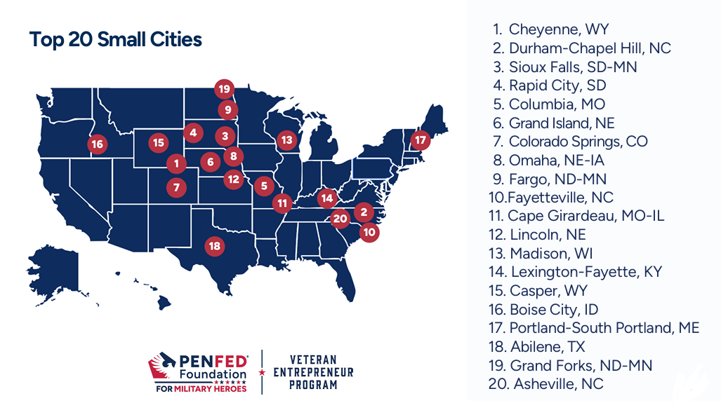 The PenFed Foundation for Military Heroes, a national nonprofit organization dedicated to supporting veterans in their transition from service to success in civilian life, announced the findings of its annual study on the top U.S. cities for Veteran entrepreneurs. The Foundation's Veteran Entrepreneur Program, which is designed to equip veteran and military spouse entrepreneurs with the tools to grow their network and scale their businesses, conducted the study in partnership with Polco and the National Research Center (NRC).