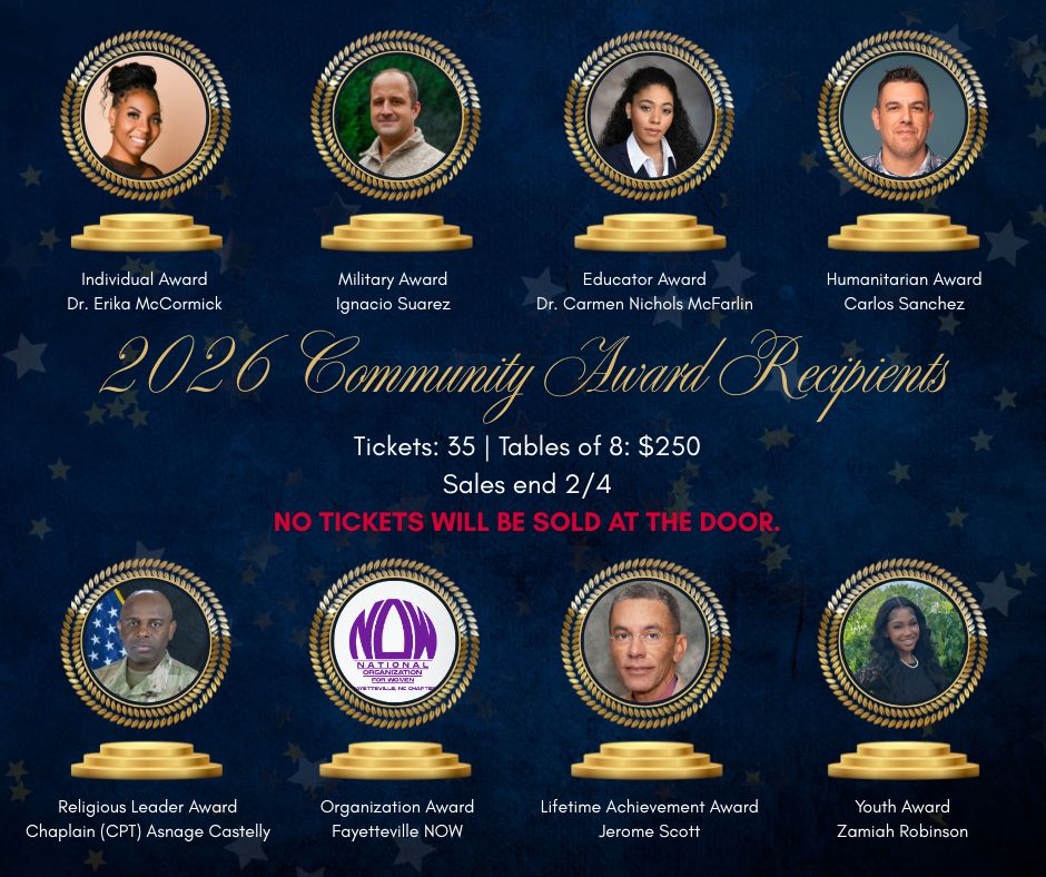 The Fayetteville-Cumberland Human Relations (FCHR) Commission has selected the recipients of the 2026 Community Awards for their excellent work and commitment to promoting positive human relations throughout Fayetteville and Cumberland County. The honorees will be presented with their awards at the annual community awards luncheon on Thursday, Feb. 12, at 11 a.m. at the Cape Fear Botanical Garden, 536 N Eastern Blvd.