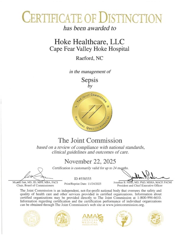 Cape Fear Valley Hoke Hospital has earned The Joint Commission’s Certificate of Distinction for Sepsis Care, recognizing its commitment to high-quality, evidence-based care for patients with sepsis.