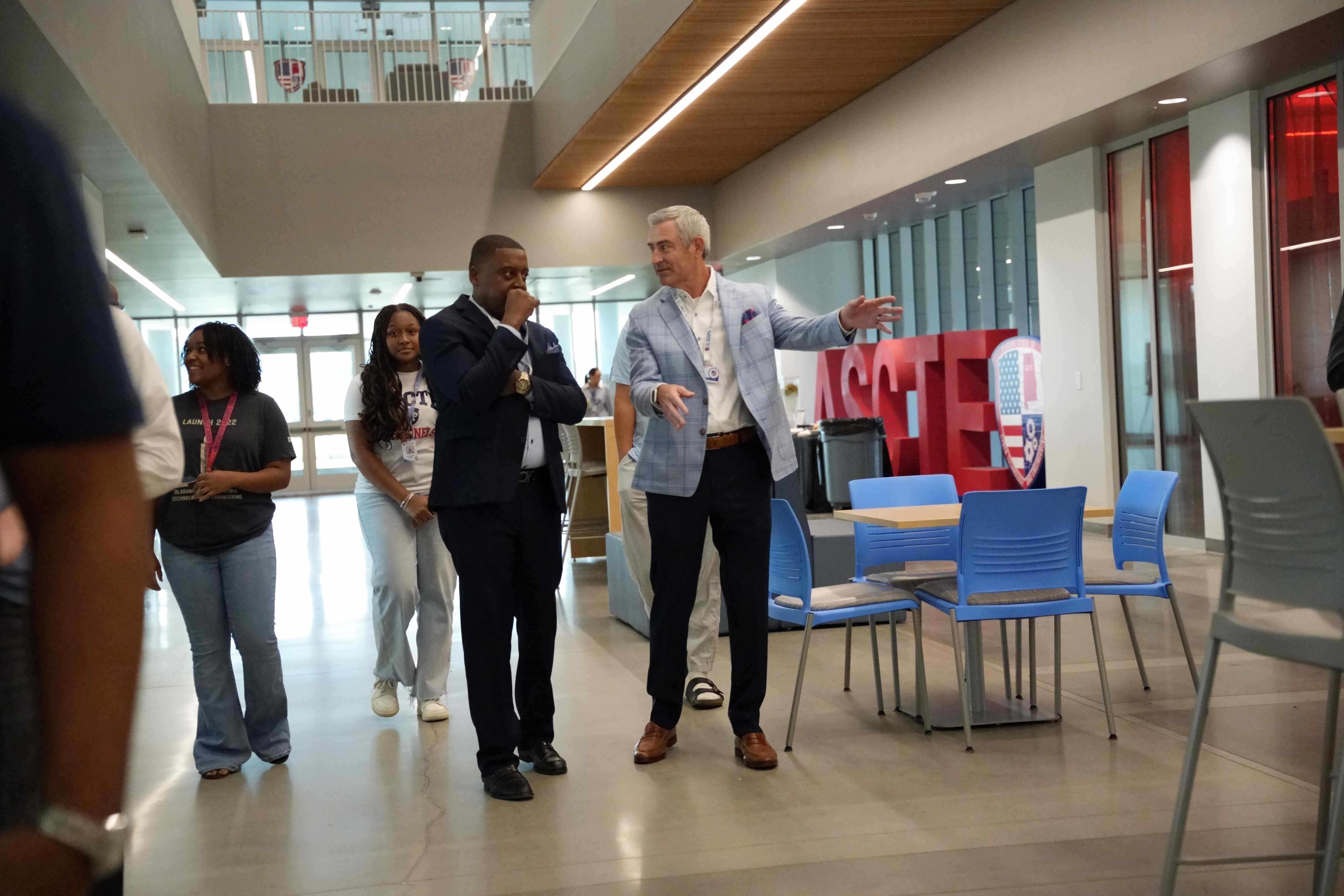 The delegation included Cumberland County Board of Commissioners Chairman Kirk deViere, City of Fayetteville Mayor Mitch Colvin, FCEDC President and CEO Robert Van Geons, and FTCC President Dr. Mark Sorrells. They toured the Alabama School of Cyber Technology and Engineering (ASCTE) and met with leaders from Science Applications International Corporation (SAIC).