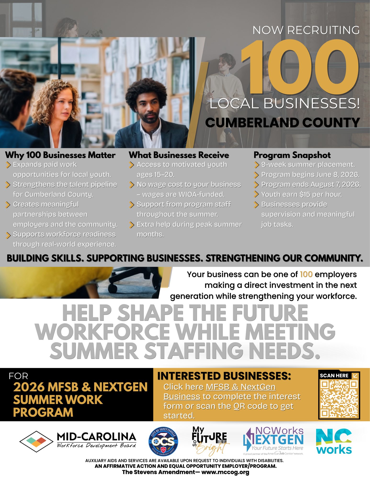 The Mid-Carolina Workforce Development Board is actively seeking local businesses to participate in the MFSB & NextGen Summer Work Program – a valuable resource to help supplement a business’s summer staffing needs while investing in the area’s future workforce.