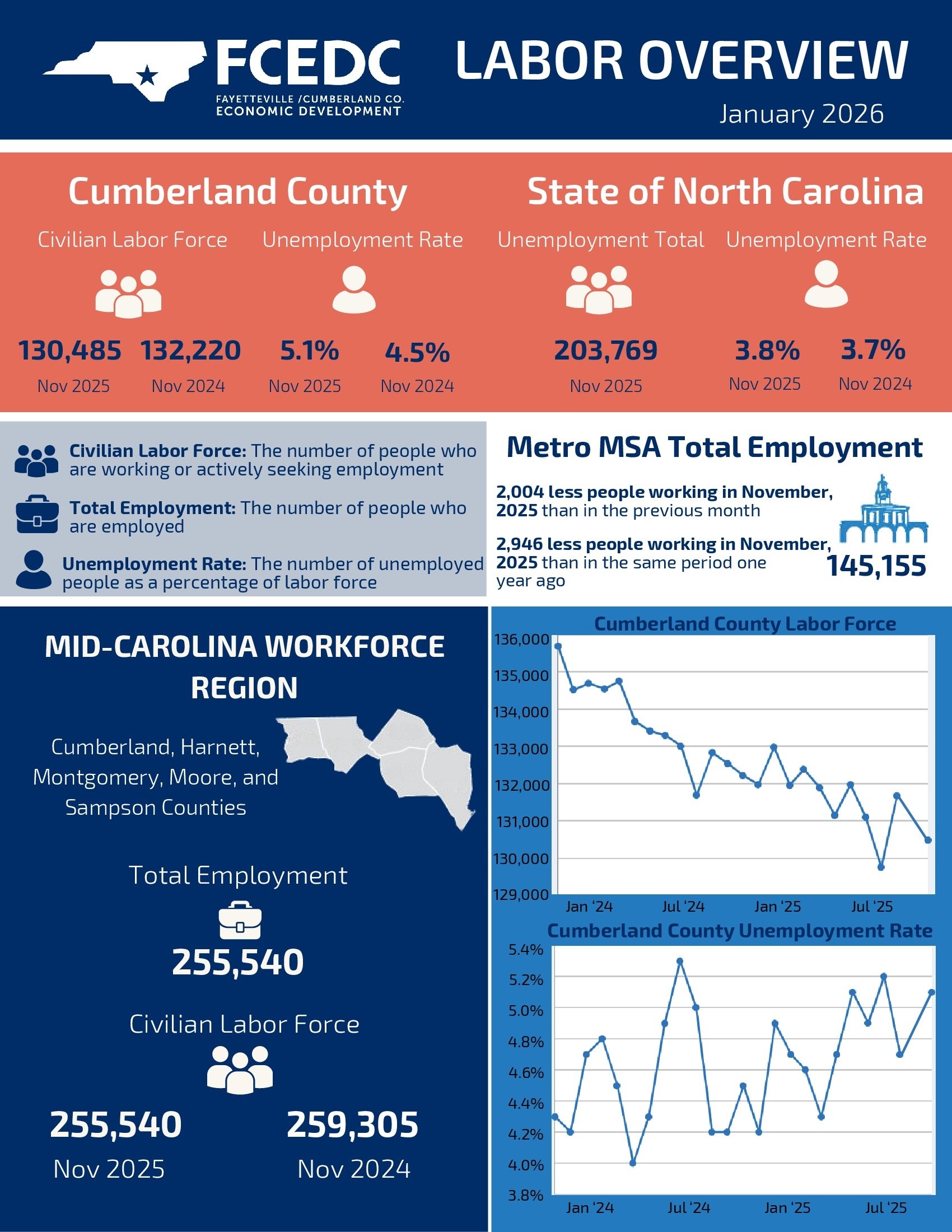 As of November 2025, the unemployment rate for Cumberland County is 5.1%. Organizations like NCWorks Career Center and Fayetteville Technical Community College’s Career Development Center aim to assist locals in finding employment. Cumberland County is home to many talented individuals, but oftentimes, they may struggle to find the right opportunity.