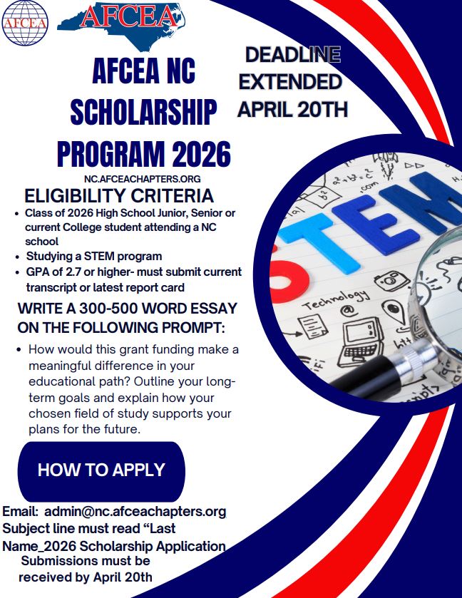 The Armed Forces Communications and Electronics Association (AFCEA) North Carolina Chapter is officially accepting applications for their 2026 Scholarship Program. AFCEA is dedicated to supporting students and teachers who are passionate about driving innovation in science, technology, engineering and mathematics.