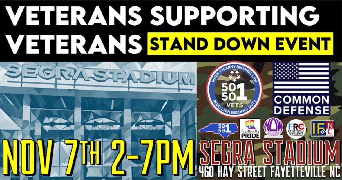 Common Defense and 50501 Vets, in partnership with the Fayetteville Resistance Coalition, are hosting a Veterans Stand Down and mutual aid event today at Segra Stadium in Fayetteville as part of the national “Veterans Say No” week of action. North Carolina veterans, service members, and military families are invited to access on-site resources, meet veteran-friendly employers, and receive support in light of ongoing federal cuts to SNAP, VA care, and other programs impacting working families.