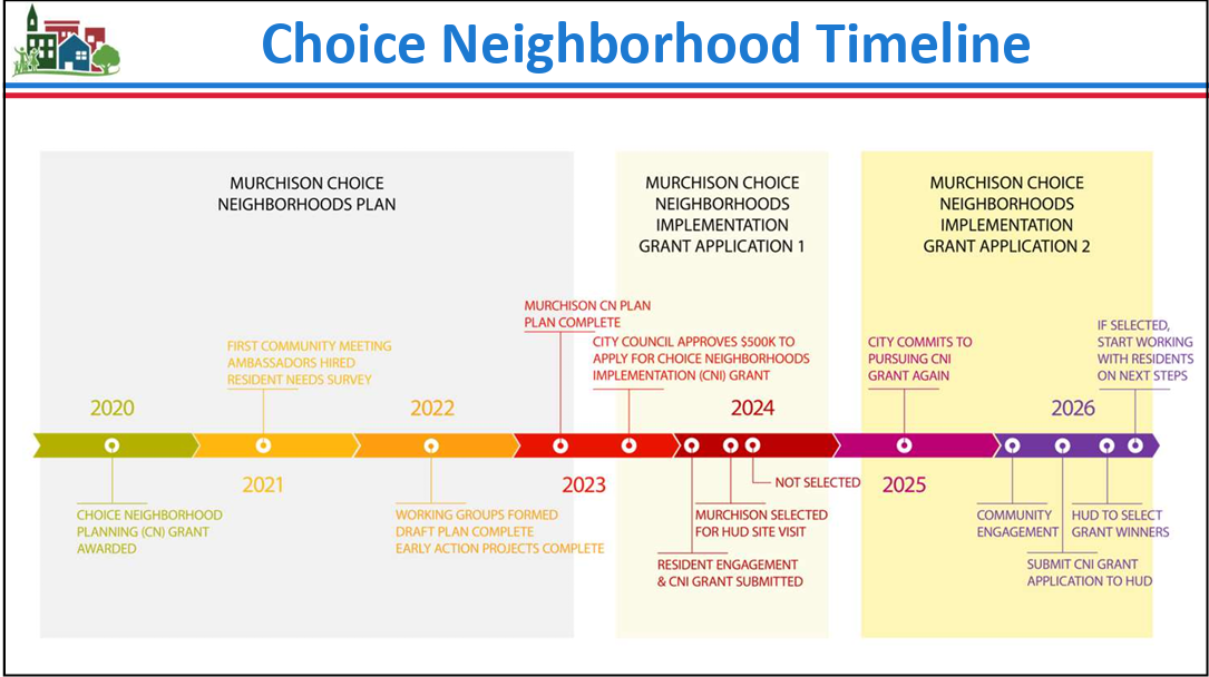 On Thursday, Feb. 12, 2026, the City's Economic and Community Development Department, in collaboration with the Fayetteville Metropolitan Housing Authority and other partners, held a community meeting regarding the Murchison Choice Neighborhood Initiative. Residents from Murchison Townhomes and the Murchison Road Community came together with Choice Neighborhood partners to receive information on the City's Choice Neighborhood Initiative Grant application.