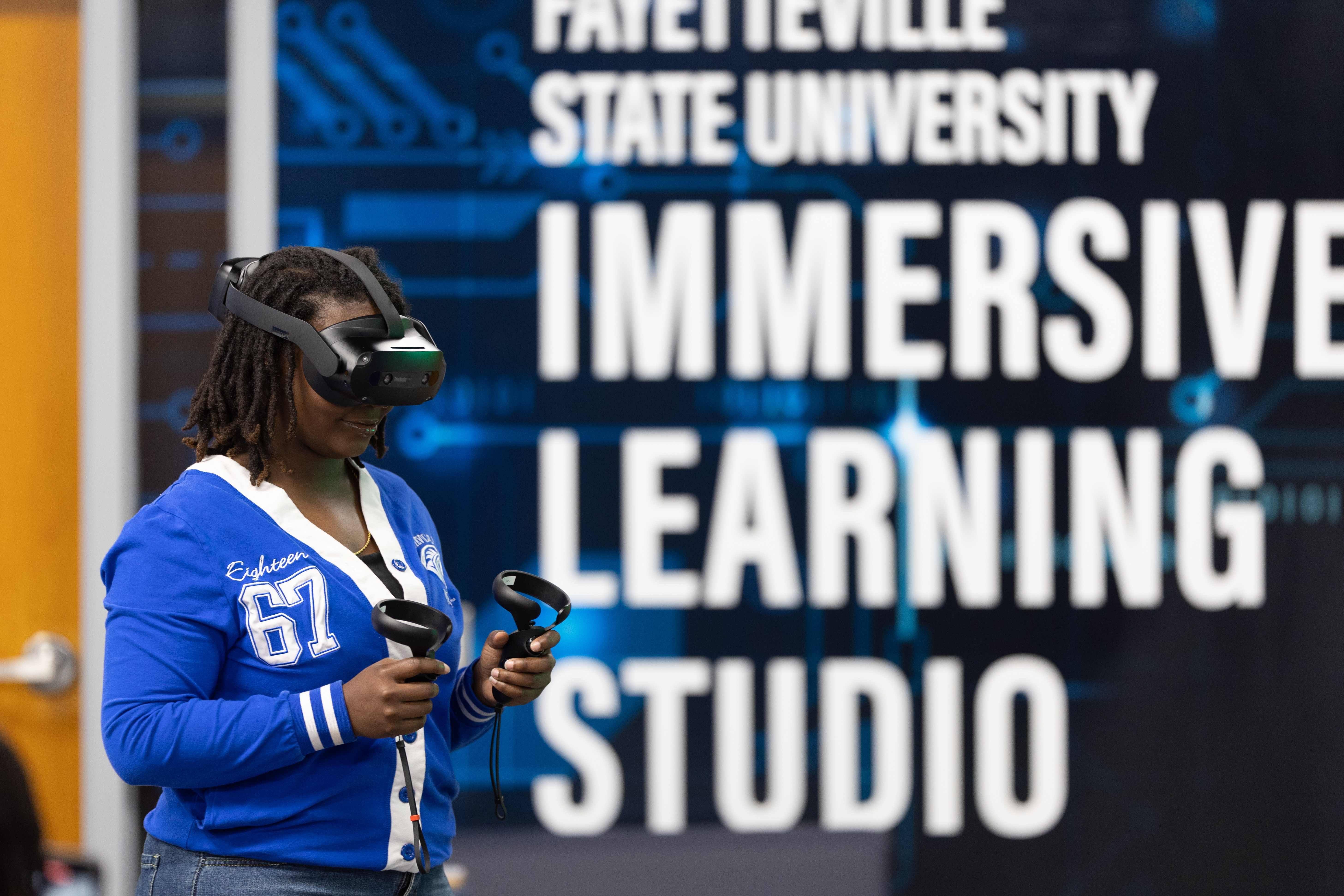 A Fayetteville State University student explores virtual reality technology inside the university’s Immersive Learning Studio. The university will expand its use of simulation-based training through a new partnership with the University of Utah and t ...
