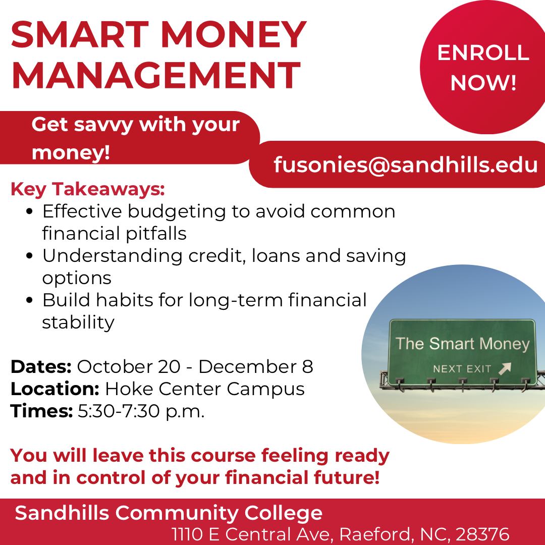 Hoke County residents have a new educational offering coming to the area with the announcement of a Smart Money Management class being offered on the Sandhills Community College Hoke Center campus.This continuing education course covers practical, re ...