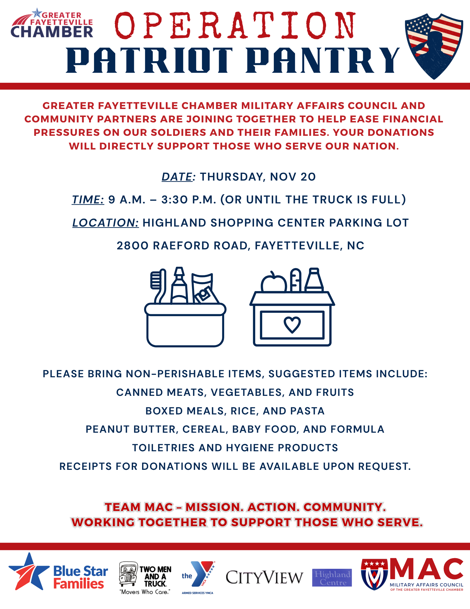 The Greater Fayetteville Chamber's Military Affairs Council (MAC) is calling all community members to donate food, clothing, toiletries and more. Recognizing the current financial pressures faced by military families and the need for immediate, ...